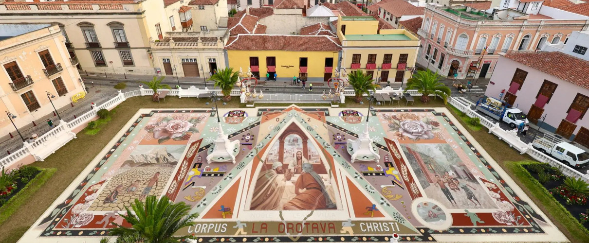 Every year in June, the town of La Orotava gets ready for Corpus Christi, a religious festival that reaches its climax when locals unroll their flower carpets and tapestries in the Old Town. The Flower Carpet is a unique, deeply-felt event, highlighting the religious feeling celebrated in Corpus Christi: the real presence of the Body and Blood, Soul and Divinity of Jesus in the elements of the Eucharist.